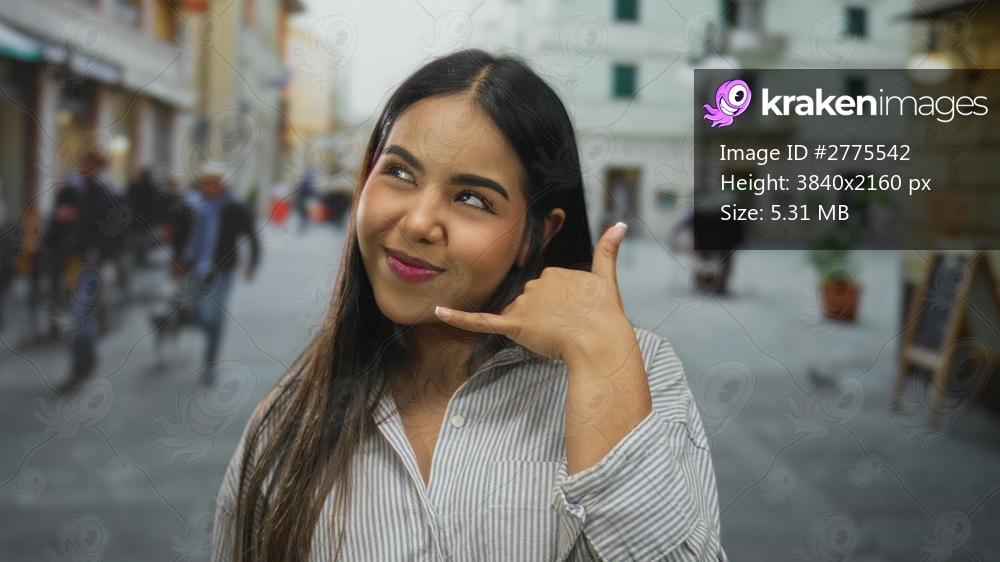 Woman hand gesturing street young latin hispanic outdoors call sign captures friendly social vibe.