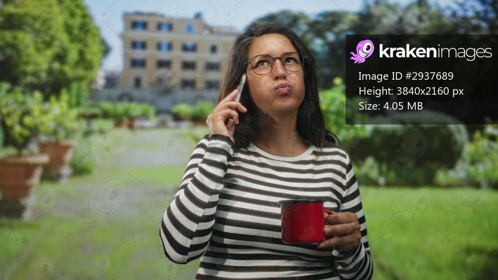 Woman hand holding red mug and phone to ear, smiling while looking at camera in front of building; casual chat contentment.