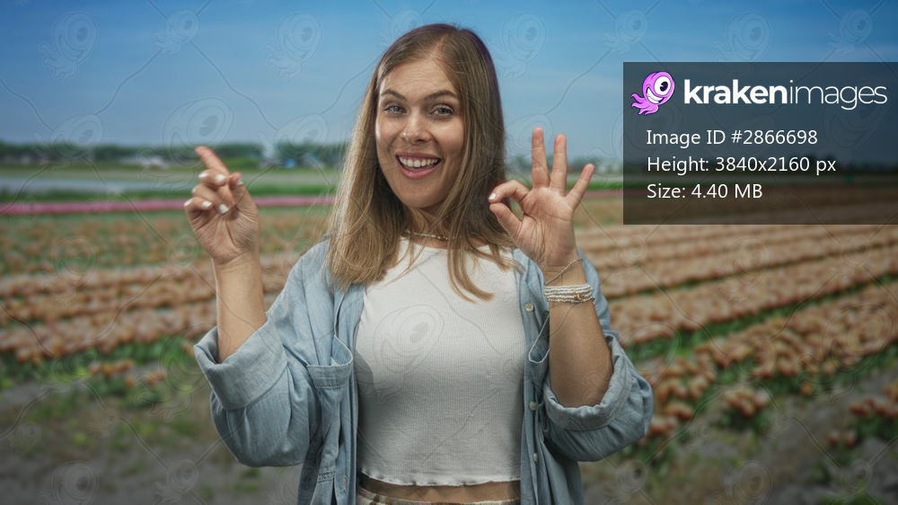 Woman hand making ok sign with right arm among flowers in forest; optimism confidence joy satisfaction.