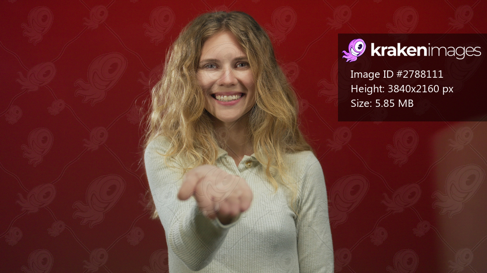 Woman hand offering studio blonde young smiling red background gesture conveys friendly invitation.