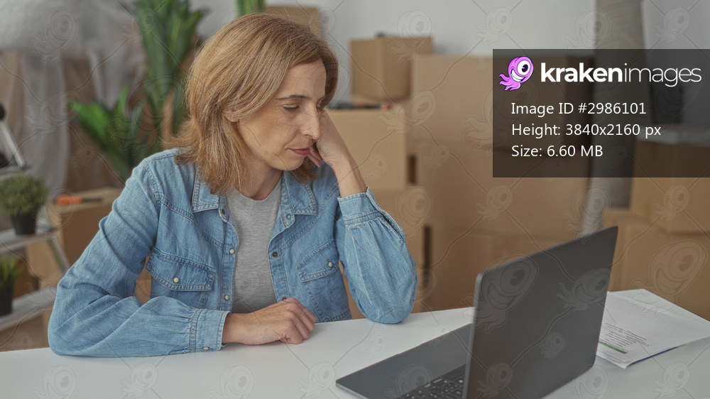 Woman with hand on cheek at laptop on desk amid stacked cardboard boxes, ladder and plants in studio; fatigue concern.