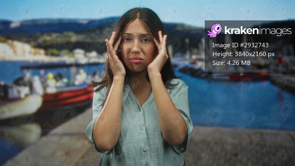 Woman with hand on cheek by boats at a street dock by the water, eyes closed and lips pursed; frustration travel fatigue.