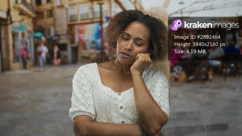 Woman with hand on cheek and eyes closed touching chin on a cobblestone street near an outdoor cafe building; pensive reflection.