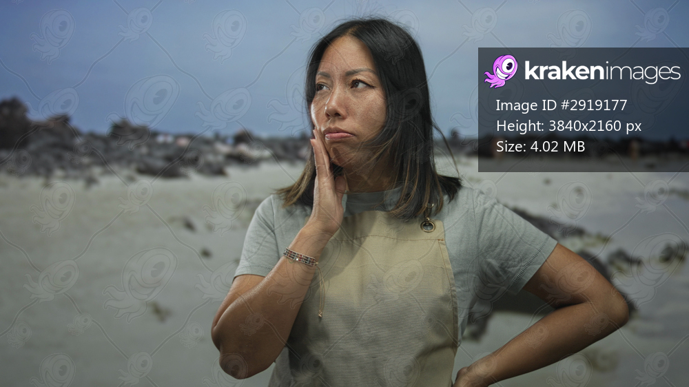 Woman with hand on cheek for toothache at beach shore wearing apron and bracelet, wind lifting hair; pensive calm.