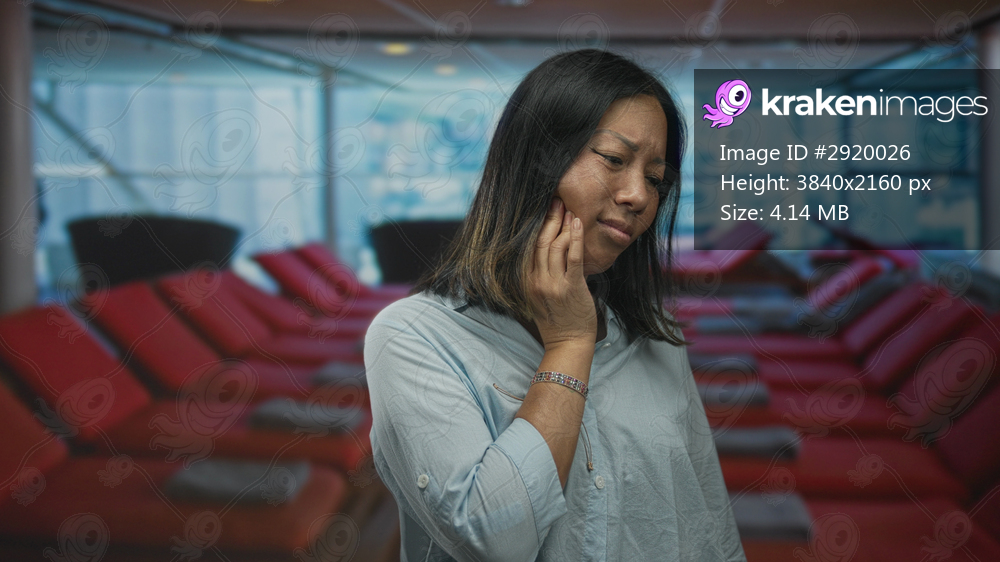 Woman with hand on cheek in lounge building by red loungers, touching jaw in mild pain; toothache concern.