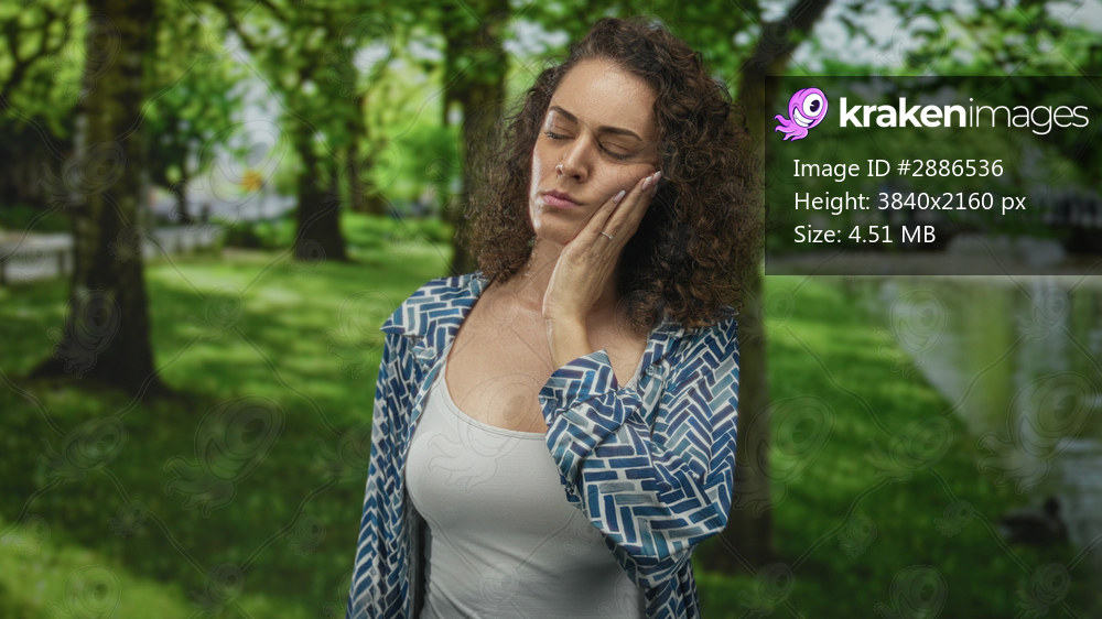 Woman with hand on cheek in park beside a pond touching bare cheek with visible toothache, wearing tank top and open shirt; discomfort.