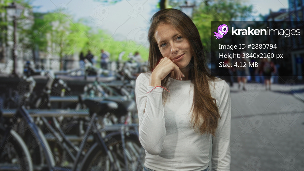 Woman with hand on cheek on amsterdam street by bicycle rack and lamppost, smiling and touching cheek; serenity daydream.