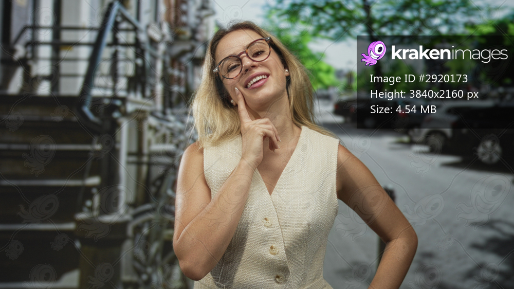 Woman with hand on cheek on street wearing glasses and sleeveless beige vest, smiling in urban outdoors; thoughtful curiosity.