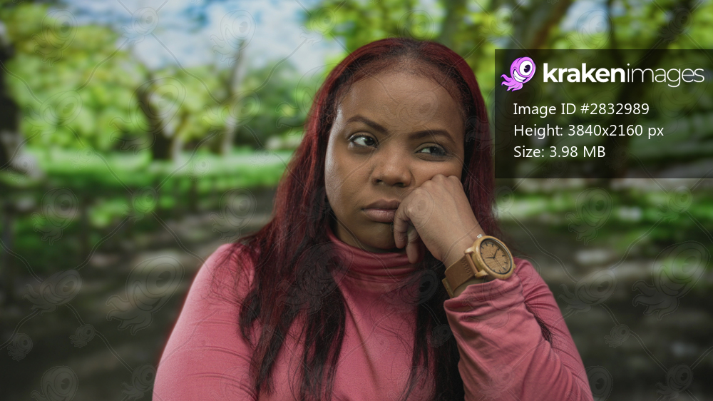 Woman with hand on cheek and wooden wristwatch visible in park setting beneath green trees; boredom.