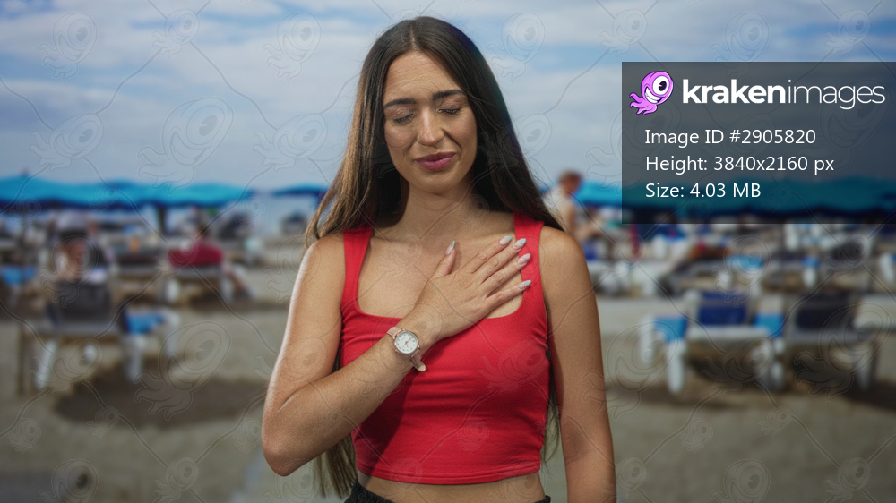 Woman with hand on chest at beach in red crop top showing a thankful smile and relaxed posture; sincere gratitude.