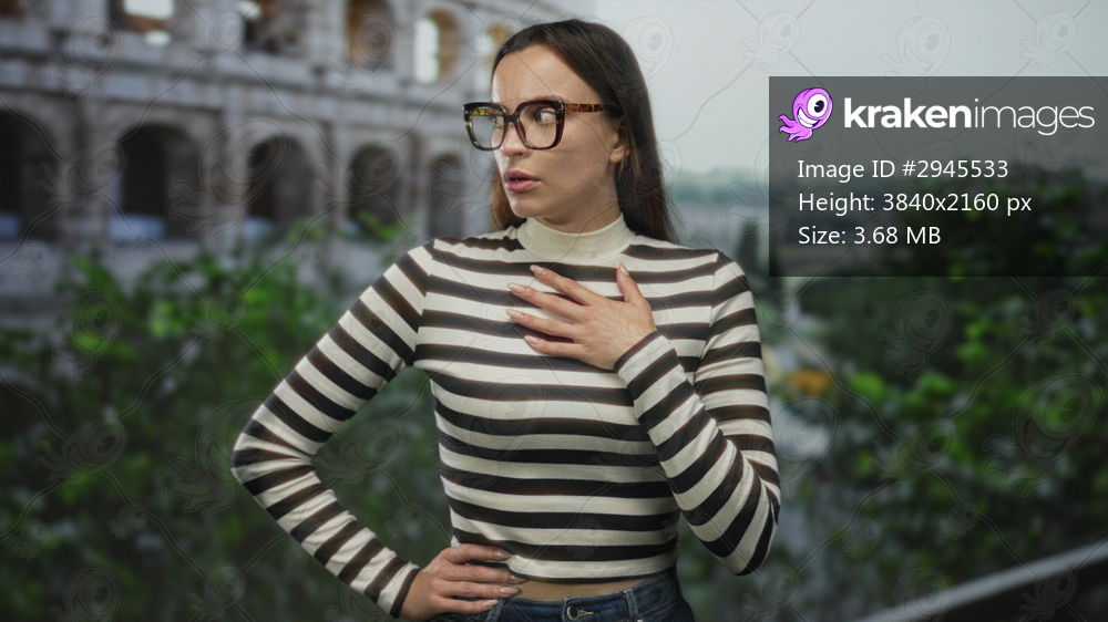 Woman with hand on chest at coliseum building wearing glasses and striped shirt, looking aside; surprise reflection.