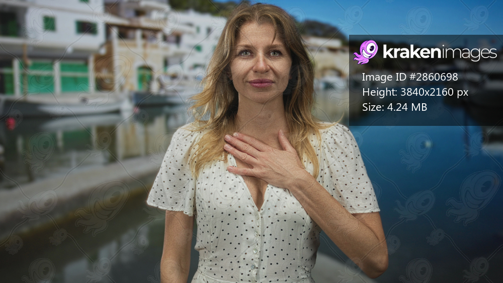 Woman with hand on chest at street beside port boats and quay, slight smile and polka dot dress showing bare hand and fingers; gratitude reflection.