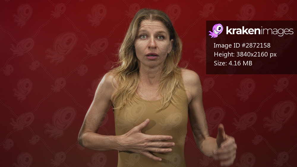 Woman with hand on chest and bare shoulder in studio with a red wall, expression of distress; fear vulnerability.