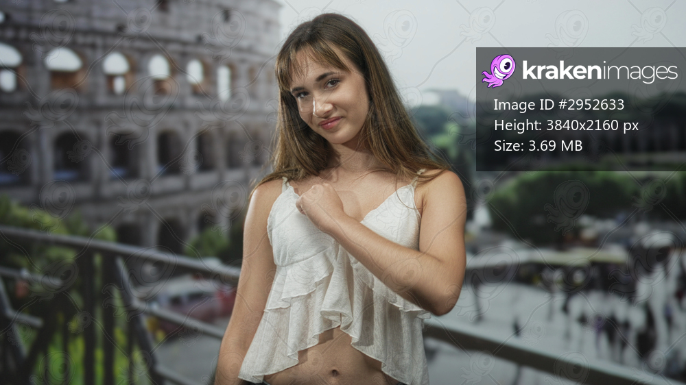 Woman with hand on chest and exposed midriff at building coliseum showing closed eyes and faint smile; serenity.