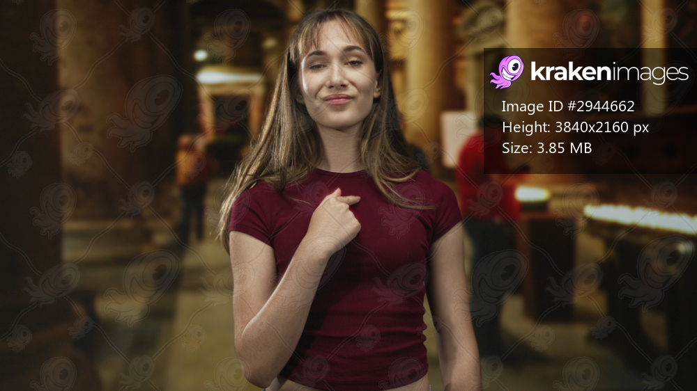 Woman with hand on chest, eyes closed in church building among candles and columns, wearing maroon shirt; devotion serenity.