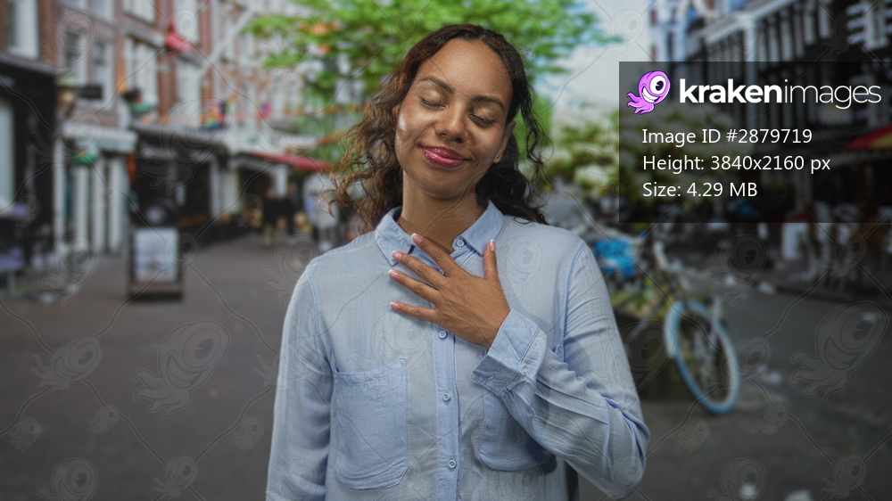 Woman with hand on chest, eyes closed and smiling gently on a busy street with bicycles and storefronts; gratitude.