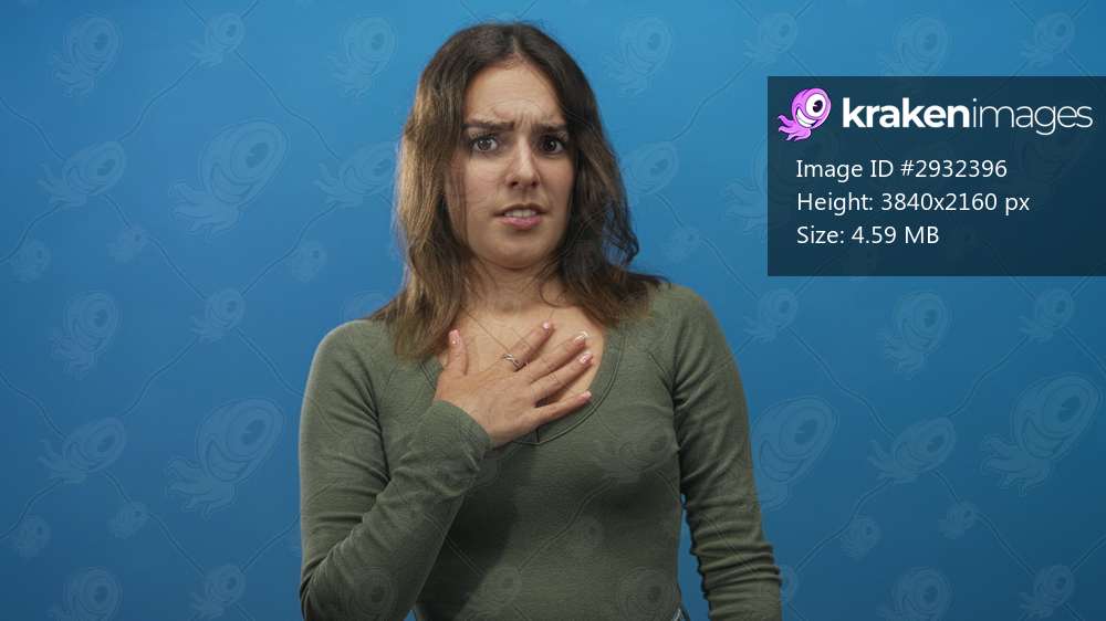 Woman with hand on chest and furrowed brow in a blue studio, facing camera in an olive top showing a startled expression; surprise.