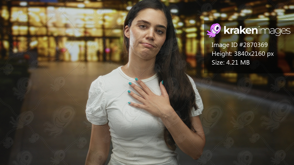Woman with hand on chest in building entrance, white shirt and long hair visible; gratitude sincerity.