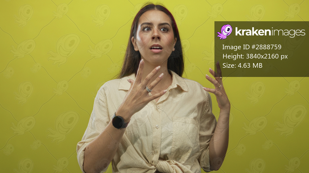 Woman with hand on chest in studio against yellow backdrop wearing beige shirt and showing rings and watch; surprise.