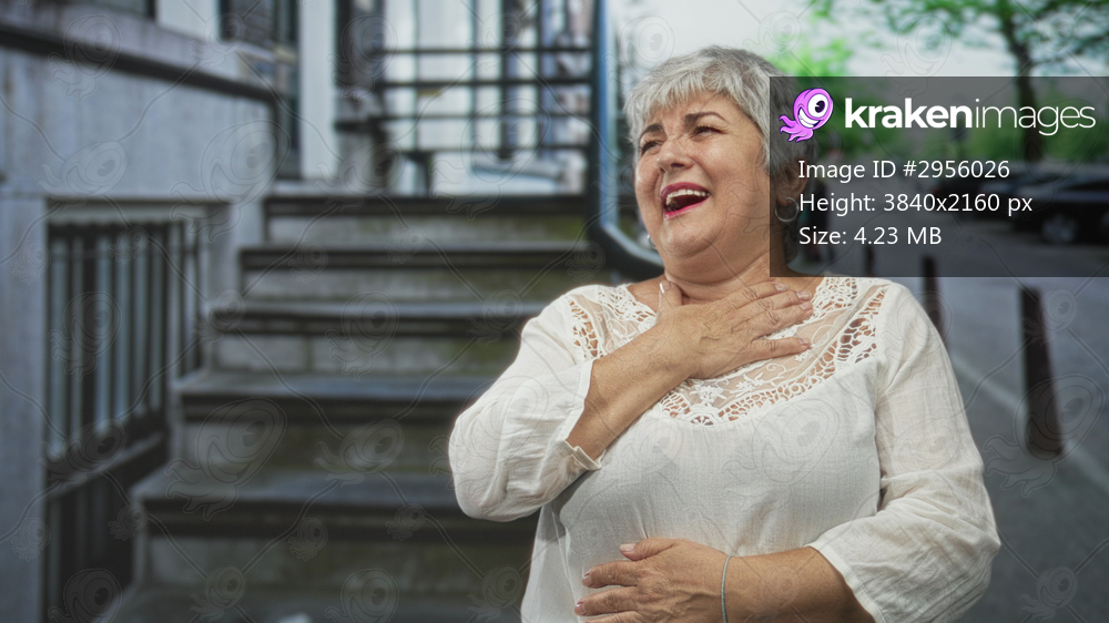 Woman hand on chest laughing on street by building stairs wearing white lace blouse and hoop earrings, mouth open in broad laugh; joy resilience.