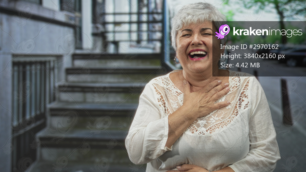 Woman hand on chest laughing on street by building stairs wearing white lace blouse and hoop earrings, mouth open in broad laugh; joy resilience.