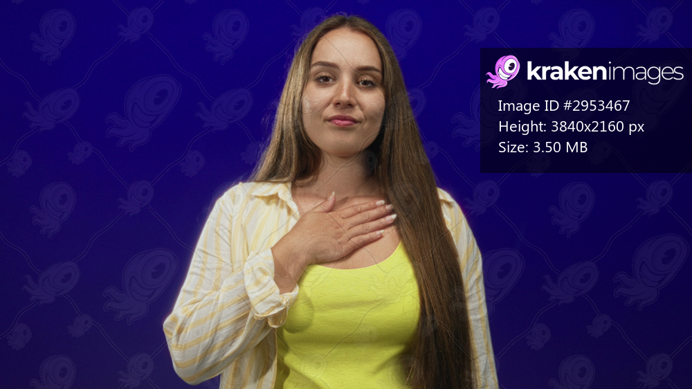 Woman with hand on chest and long hair wearing yellow tank top and open striped shirt, soft smile in blue studio; gratitude.
