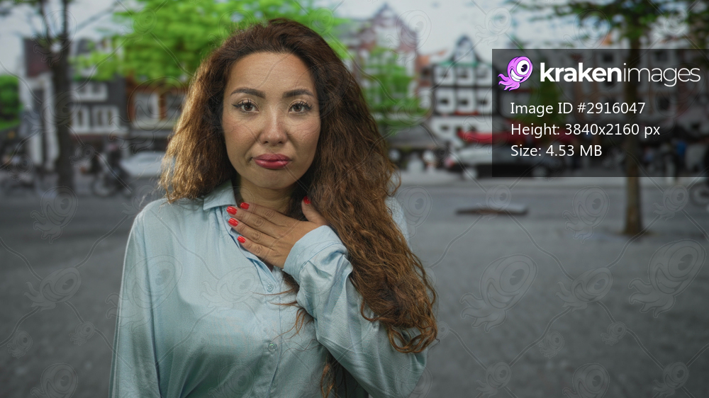 Woman with hand on chest on a street, red nails visible and uneasy expression; concern vulnerability.
