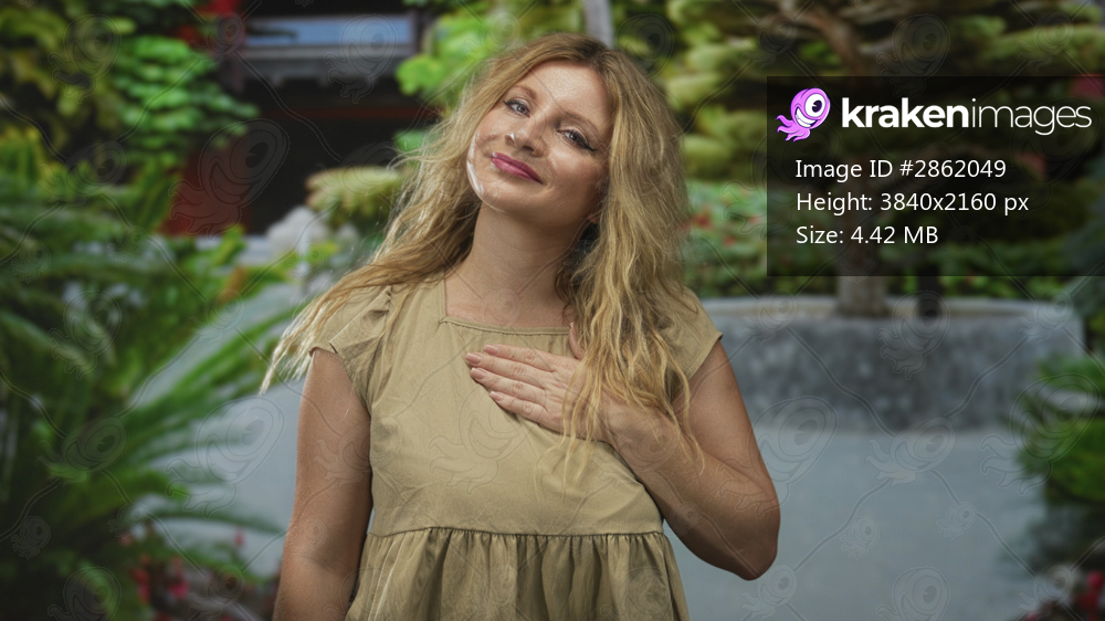 Woman with hand on chest smiling at camera in forest park pathway, blonde hair loose, casual beige top and relaxed posture; gratitude.