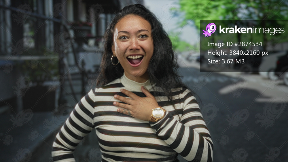 Woman with hand on chest smiling on a city street, wearing striped top and gold watch with hoop earrings; surprise gratitude warmth.
