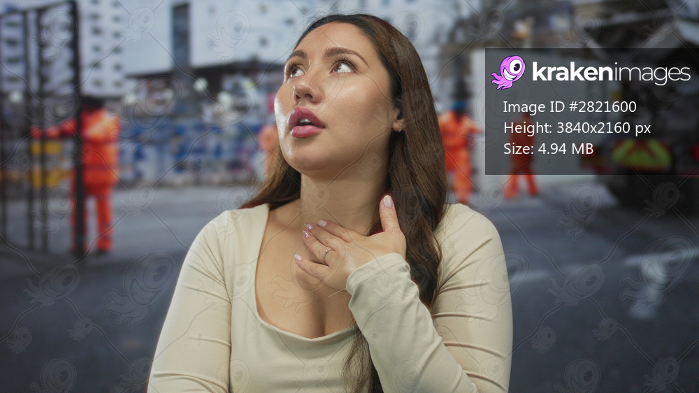 Woman with hand on chest standing before tall building framework under cloudy sky as blurred construction workers move behind her; pain.