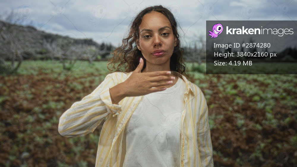 Woman with hand on chest standing in a cultivated field under cloudy sky wearing striped shirt and white tshirt and gold necklace; contemplation.