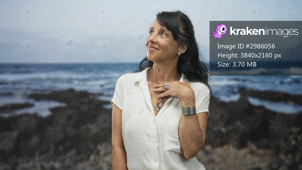 Woman with hand on chest touching pendant in white shirt on rocky shore street; quiet reflection serenity.