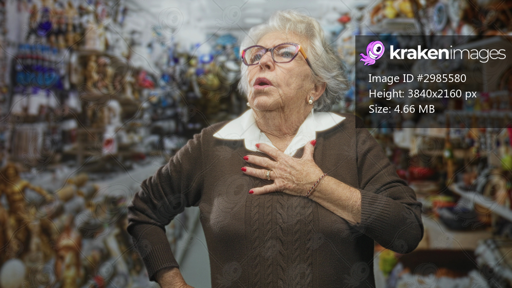 Woman with hand on chest, wearing glasses, ring and brown sweater in a crowded shop building lined with shelves of trinkets and pottery; nostalgia surprise. - Kraken Images