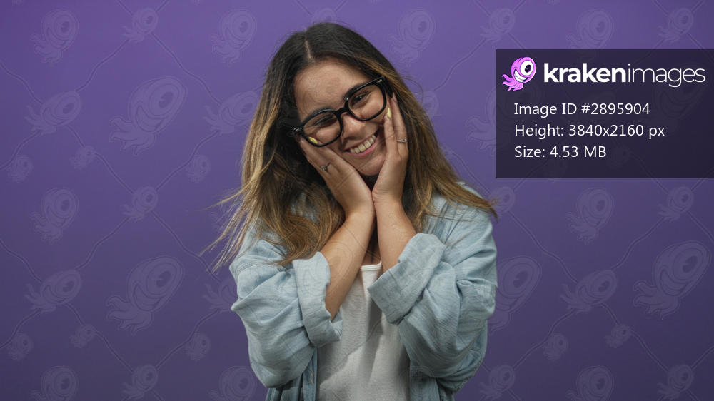 Woman with hand on chest wearing glasses, white tank top and denim shirt, long hair and yellow nails in purple studio; surprise vulnerability.