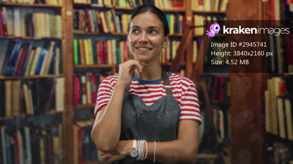 Woman with hand on chin and arms crossed in library wearing red striped shirt and apron; thoughtful curiosity learning.