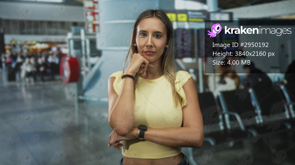 Woman with hand on chin and arms folded at airport terminal wearing yellow top and watch, posing in waiting posture; calm.