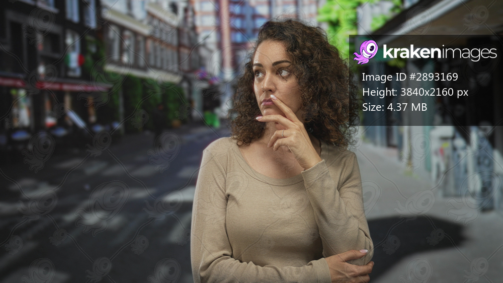Woman with hand on chin at a city street crosswalk, neutral expression and folded arm across body, visible ring on finger; quiet contemplation.