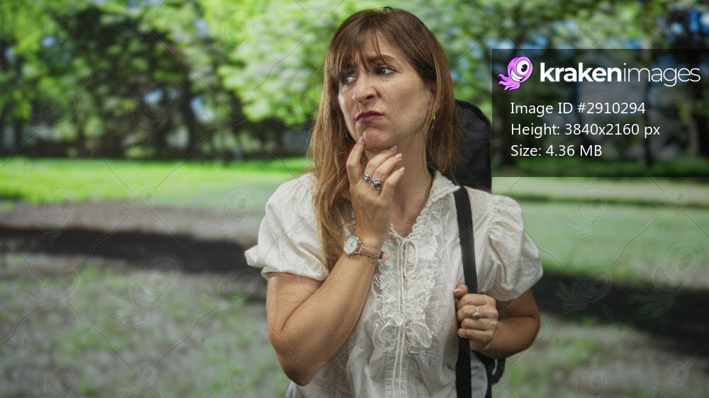 Woman with hand on chin clutching a backpack in forest with green trees and grassy path, facial grimace and tight grip; concern.