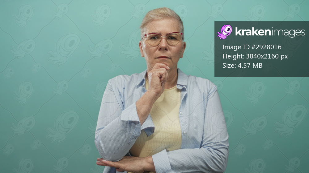 Woman with hand on chin and crossed arm, wearing glasses and short hair in studio portrait with teal wall; thoughtful introspection.