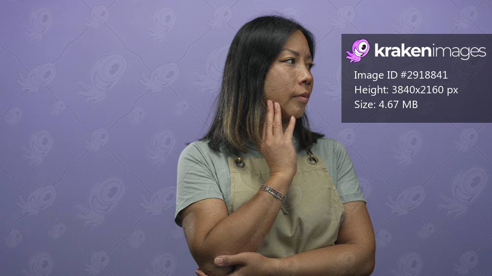 Woman with hand on chin and crossed arms in purple studio setting, wearing beige apron and short sleeve shirt, looking pensive and thoughtful; contemplation. - Kraken Images
