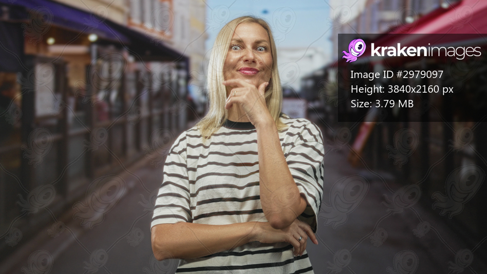 Woman with hand on chin and crossed arms wearing a striped shirt, pensive gesture on a narrow city street cafe; contemplation choice.