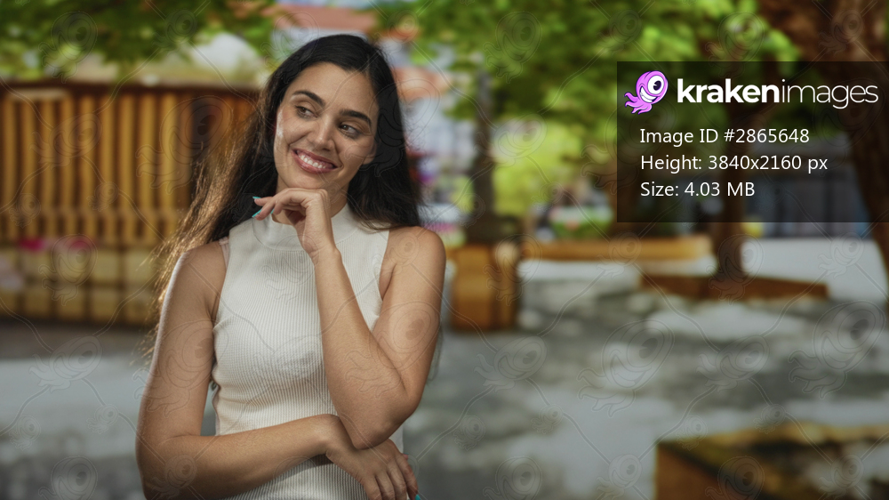 Woman hand on chin and eyes closed on sunny street outdoors with long dark hair swaying; reflection.