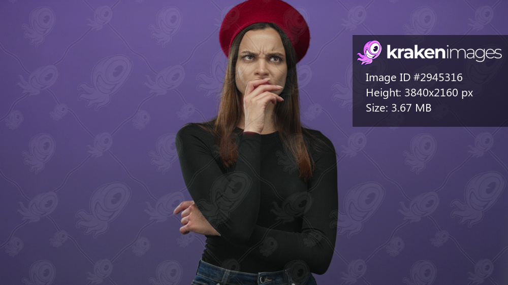Woman with hand on chin and finger near lips in purple studio wearing red beret and black long sleeve shirt, thoughtful expression; pensive curiosity.