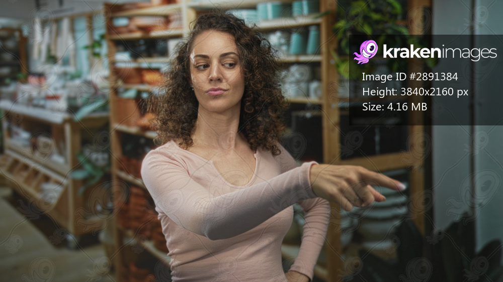 Woman with hand on chin and finger pointing amid shelves in a decor store, indoor home interior; thoughtful purchase decision.
