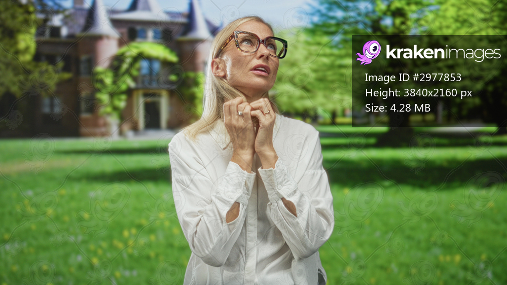 Woman with hand on chin and fingers at jaw wearing large glasses and white blouse in front of a building on green lawn, pensive expression; quiet contemplation. - Kraken Images