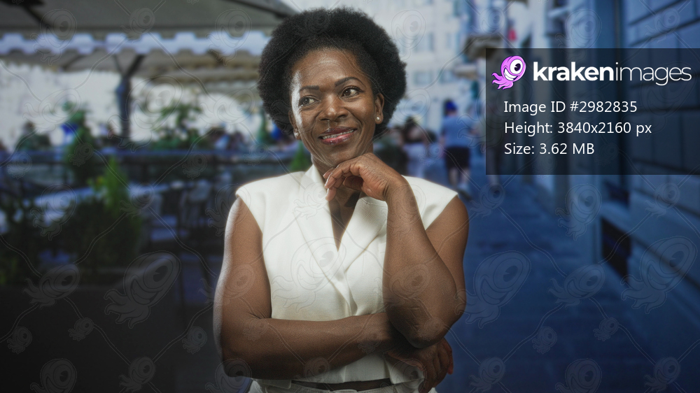 Woman with hand on chin and folded arm, smiling at camera on a street cafe terrace; confidence reflection.