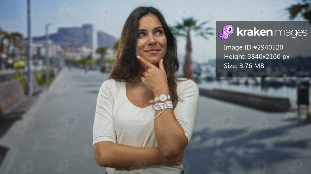 Woman with hand on chin and folded arm wearing white top and watch at port marina promenade beside moored boats; thinking pondering thought contemplative. - Kraken Images