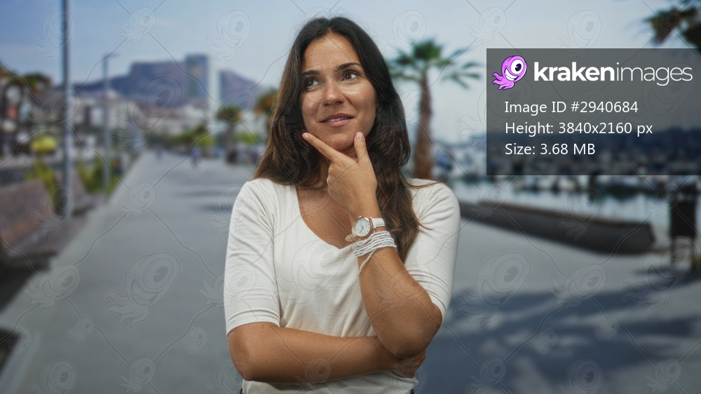 Woman with hand on chin and folded arm wearing white top and watch at port marina promenade beside moored boats; thinking pondering thought contemplative. - Kraken Images