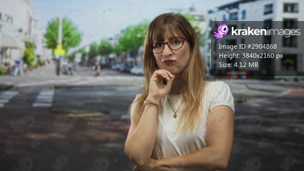 Woman hand on chin and folded arms at a busy street crosswalk in front of city buildings; thoughtful doubt.