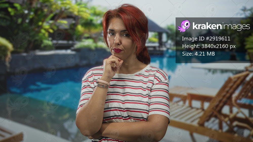 Woman with hand on chin and folded arms at poolside building with lounge chairs and tropical plants; thoughtful reflection.